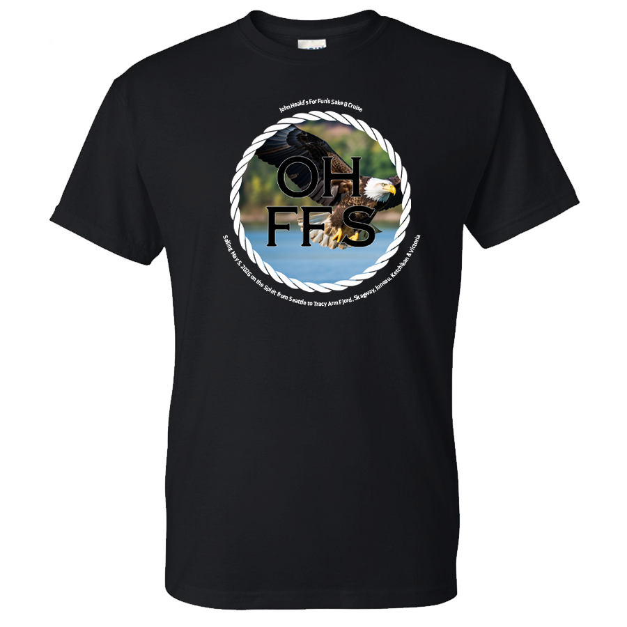 This tee features a striking bald eagle graphic, symbolizing freedom, fun, and the larger-than-life spirit of an Oh For Fun Sake cruise.